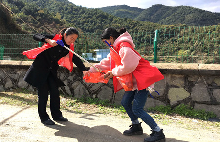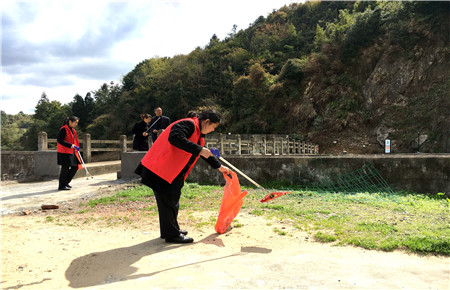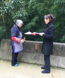圖為女職工向當?shù)乩先诵麄髑迕魑拿骷罀?/span> 然而,女職工們卻不“安分守己”,以這樣的方式來慶祝自己的節(jié)日:她們兵分二路,一路擔起森林防火宣傳員,向過往群眾發(fā)放《清明文明祭掃和森林防火倡議書》,并對上了年紀的村民耐心講解倡議書內(nèi)容,將臺州高速的文明服務從工作中延伸到了生活中。一路環(huán)繞水庫去清理其邊上的垃圾,一上午下來,收獲還真不少,共清理廢紙、飲料罐、塑料袋等廢棄物若干袋,在打造“生態(tài)文明”中率先垂范,擔其責,盡其力。