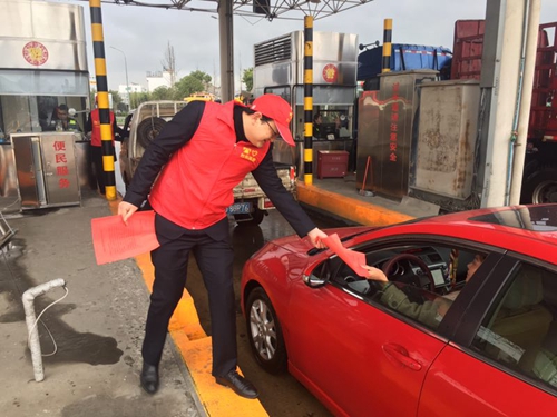 圖為員工在車道向過往司乘發(fā)放《清明文明祭掃和森林防火倡議書》