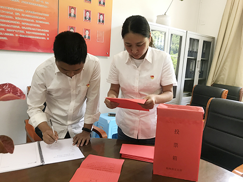 圖為投票現(xiàn)場(chǎng) 會(huì)議通過(guò)舉手表決方式一致通過(guò)了選舉辦法和監(jiān)票人、計(jì)票人名單。本次選舉大會(huì)應(yīng)到正式黨員11名,實(shí)到10名。經(jīng)過(guò)計(jì)票、監(jiān)票等程序,以差額無(wú)記名方式推選孫明偉、周戰(zhàn)、陳瑩三名同志為新一屆支部委員會(huì)委員。在隨后召開(kāi)的支委會(huì)第一次會(huì)議上,選舉孫明偉任支部書(shū)記,周戰(zhàn)任紀(jì)律委員,陳瑩任組織宣傳委員。