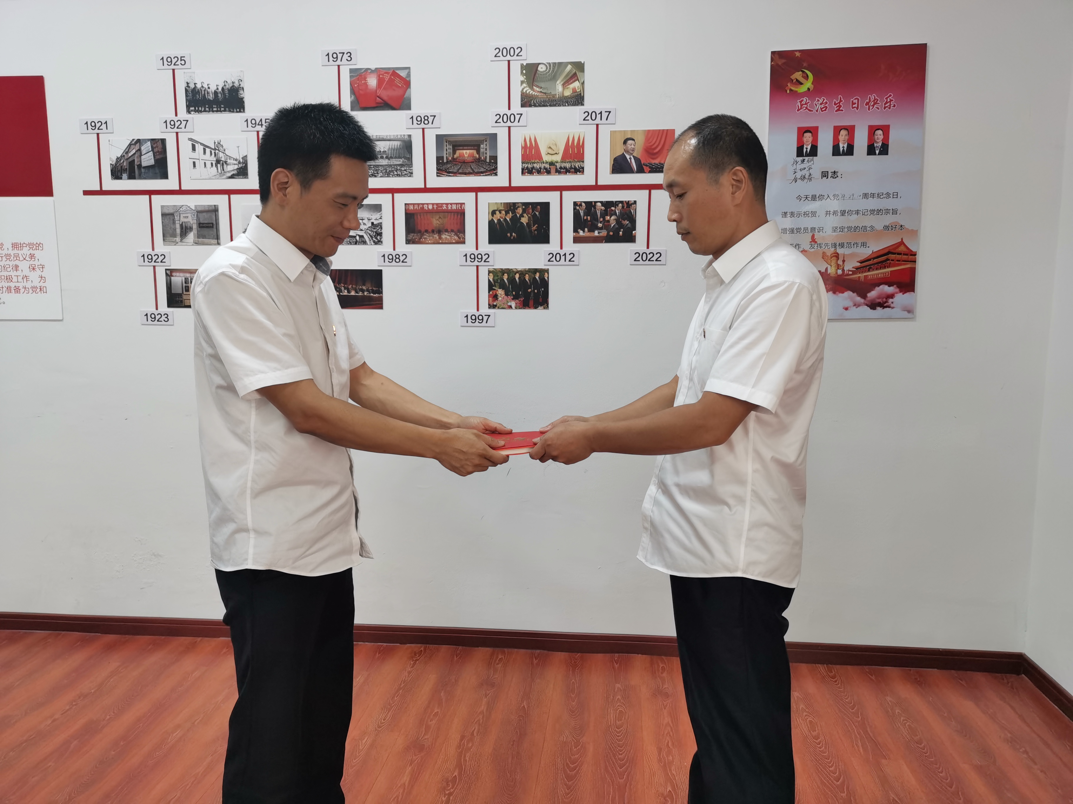 王加平、鄭建鋼分別是有著29年、24年黨齡的老黨員,他們向其他黨員分享了各自入黨以來的心路歷程,從工作中的細微處做起,深刻檢討自己在發揮黨員先鋒模范作用上做的不足之處,激勵和鞭策自己。他們一句句質樸的語言,讓我們走進了他們的生活,感受了他們不忘初心的激情歲月。在活動過程中,支委成員為過生日黨員贈送了賀卡。